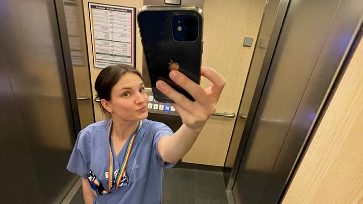 Jag är stolt över min sjuksköterskeskylt på bröstet