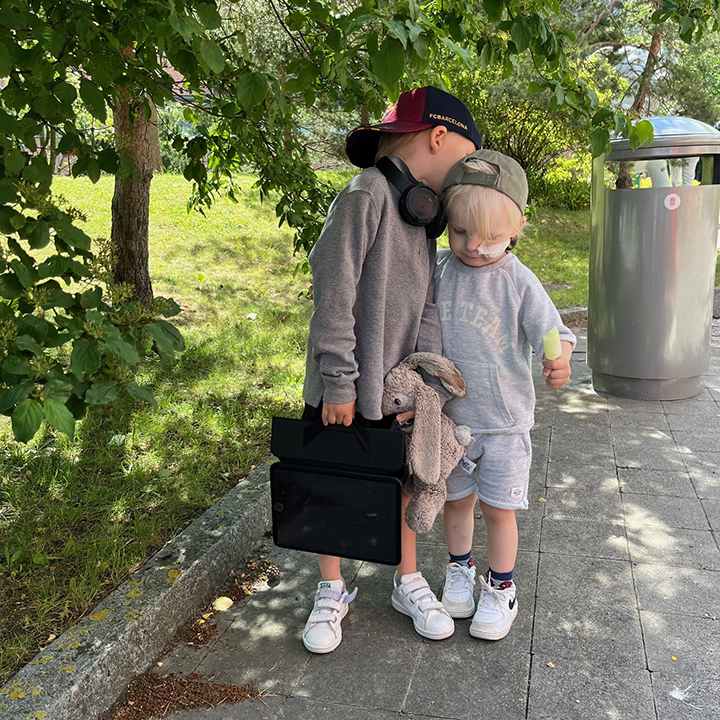 Storebror August och lillebror innan de säger hejdå för att separeras i ca 12 veckor under Olivers benmärgstransplantation.
