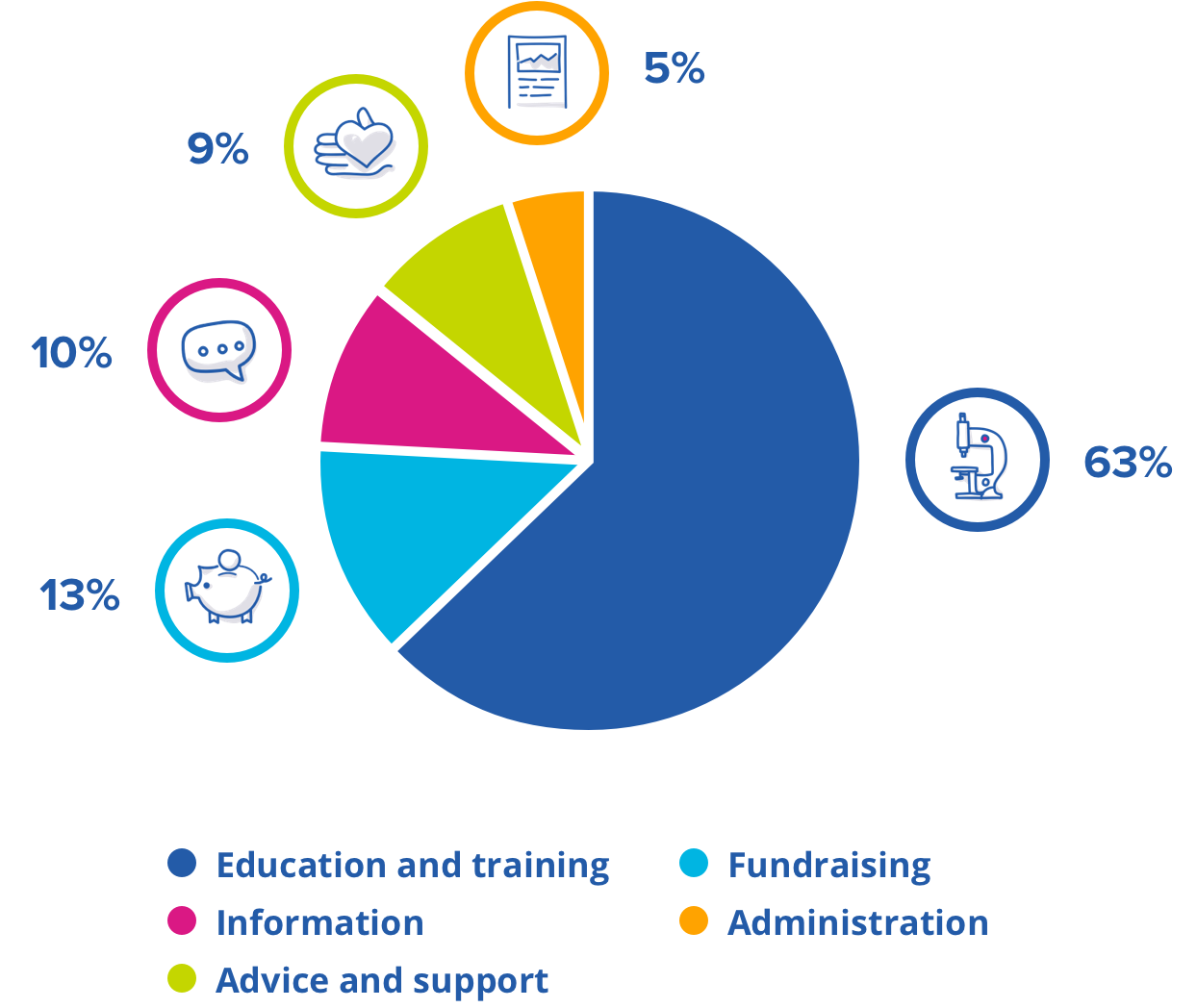 The majority of the funds we raise are used to finance research into childhood cancer diseases. At the same time, our work providing advisory services and support initiatives to children with cancer and their families, as well as our efforts to increase awareness of childhood cancer, are crucial if we are to achieve our vision. Our fundraising efforts are also an important component of our operations, to which 13 per cent of our donations are allocated. We are extremely careful here to ensure that every cent spent should generate clear value, so that we can do the most possible good for those who truly need it. A total of 5 per cent were used to cover administrative expenses.