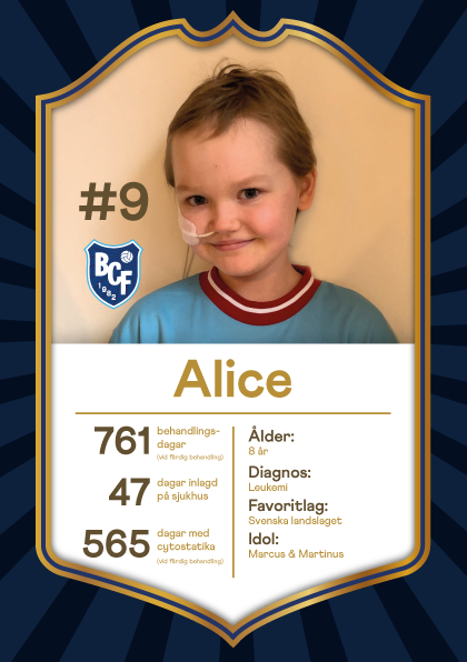 Alice, 8 år, som just nu behandlas för leukemi har sövts 18 gånger för att få cytostatika i ryggmärgen. Rörelse i form av gymnastik, innebandy och skidåkning är lika med glädje för Alice. När det gäller fotboll är favoritlaget Sverige. Idolerna? Marcus och Martinus!