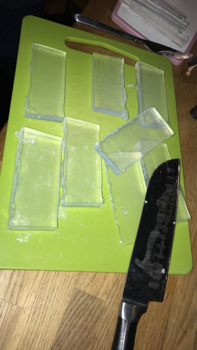 Första steget att hacka tvålmassan i mindre bitar så den går att smälta. Den kommer som ett block på 1kg.