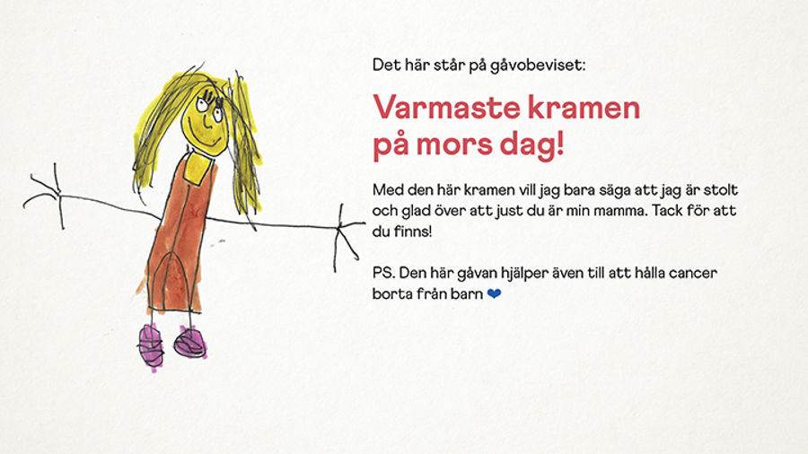 Mors dag har firats sista söndagen i maj ända sedan dagen introducerades år 1919. Det är dagen vi tar tillfället i akt och visar våra älskade mammor hur mycket de betyder för oss. Sprid lite kärlek genom att ge bort ett gåvobevis på mors dag. Då sprider du samtidigt hopp till barn med cancer och deras familjer.