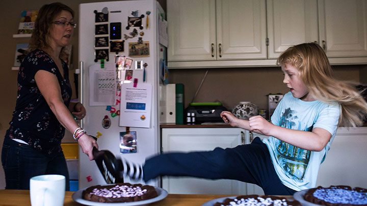 – Mina kladdkakor måste nämligen stå en natt i kylskåpet, det blir inte lika god smak annars. Jag gillar inte florsocker så jag lägger strösselhjärtan och pärlor på kakorna istället, säger Joakim och springer iväg för att visa upp den sparkspade som han använder i sin taekwondoträning.