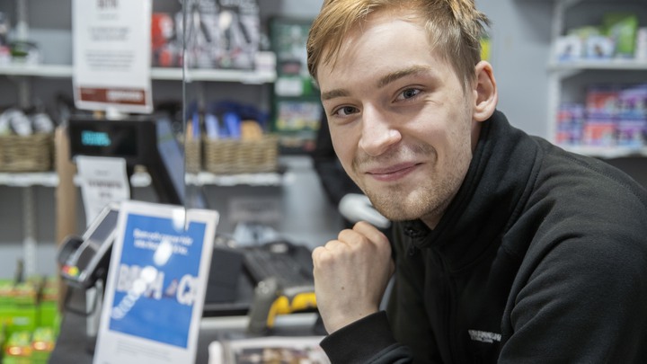 – Nu har jag gjort dagens goda gärning och du har hjälpt mig, säger hon till Elias Daniels bakom kassan.